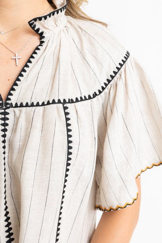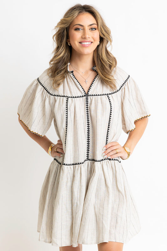 Stripe Linen Embroidered Vneck Dress