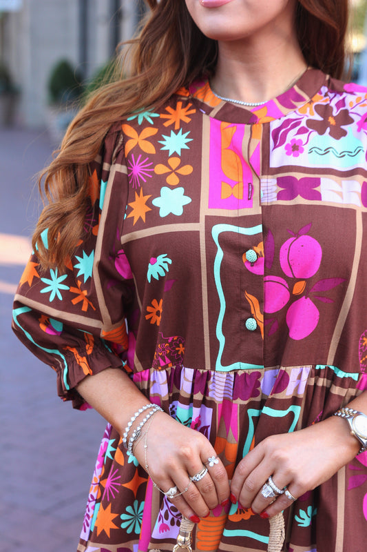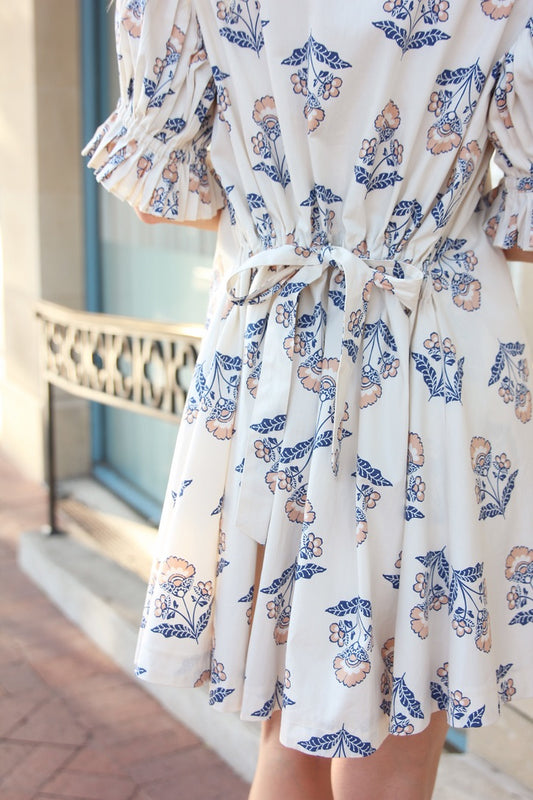 Floral Frame Puff Sleeve Shirt Dress with Tie